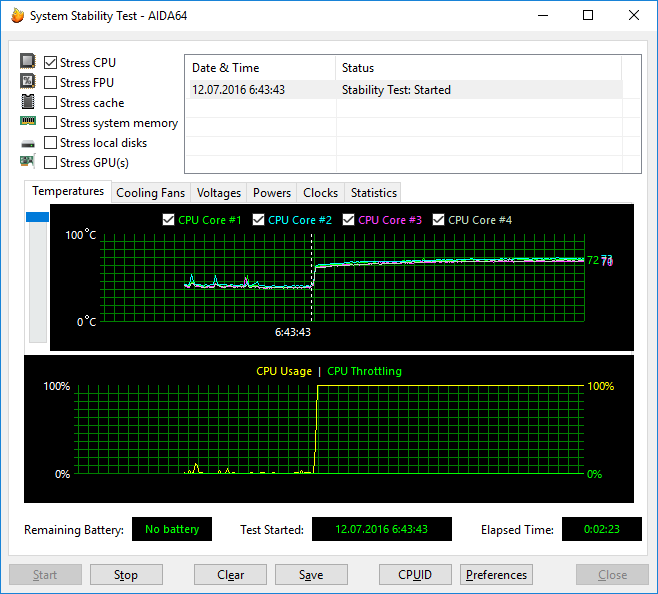 При загрузке процессора тестом Stress CPU (утилитой AIDA64 Extreme Edition — тест на стабильность системы), который использует целочисленные вычисления, частота процессора составляет 4,0 ГГц (напомним, что для процессора Intel Core i7-6700K максимальная частота в режиме Intel Turbo Boost составляет 4,2 ГГц). Температура процессора в этом режиме загрузки увеличивается до 73 °С.