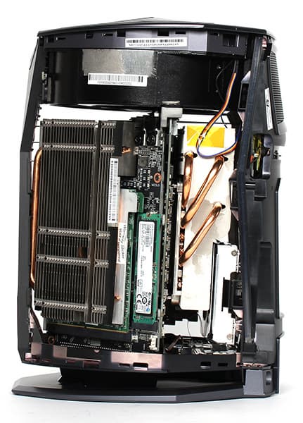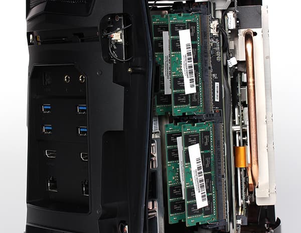 Сняв же боковые панели и верхнюю панель корпуса, можно получить доступ к четырем модулям памяти, HDD и одному SSD (напомним, что в компьютере установлено два SSD, но доступ можно получить только к одному). Именно эти компоненты можно легко заменить при необходимости.