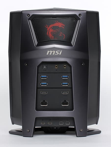 На задней панели корпуса расположены все интерфейсные разъемы: два аудиоразъема, оптический выход S/PDIF, четыре порта USB 3.0 (Type-A), два сетевых разъема RJ-45, два видеовыхода HDMI.