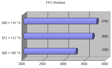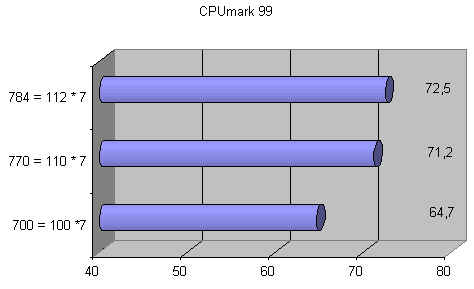 На плате Abit KT7 удалось достичь более значительных результатов — частота процессора увеличилась более чем в полтора раза. Максимальная производительность в целочисленных вычислениях достигается при режиме 896 МГц = 115 МГц * 8, а в вычислениях с плавающей точкой — при частоте 910 МГц.