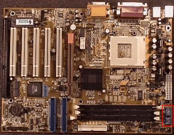 Выбор значения частотного множителя процессора при использовании материнской платы Soltek SL-KV75+ осуществляется с помощью соответствующего DIP-переключателя (выделено на фото платы Soltek SL-KV75+).