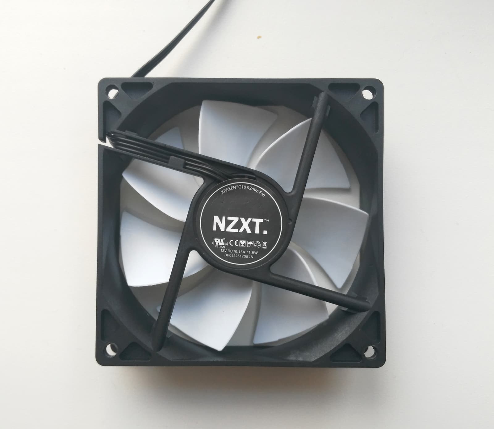 В комплекте с NZXT Kraken X31 поставляется один фирменный вентилятор RF-FX122-HP. Эта 7-лопастная модель подключается к основному блоку посредством стандартного 4-контактного разъема и поддерживает ШИМ-управление. Этот тип вентиляторов имеет достаточно широкий диапазон скорости вращения — от 800 до 2000 об/мин и, согласно спецификации, при максимальной скорости вращения создает воздушный поток 81,32 м³/мин, а уровень шума от него достигает 34 дБА.