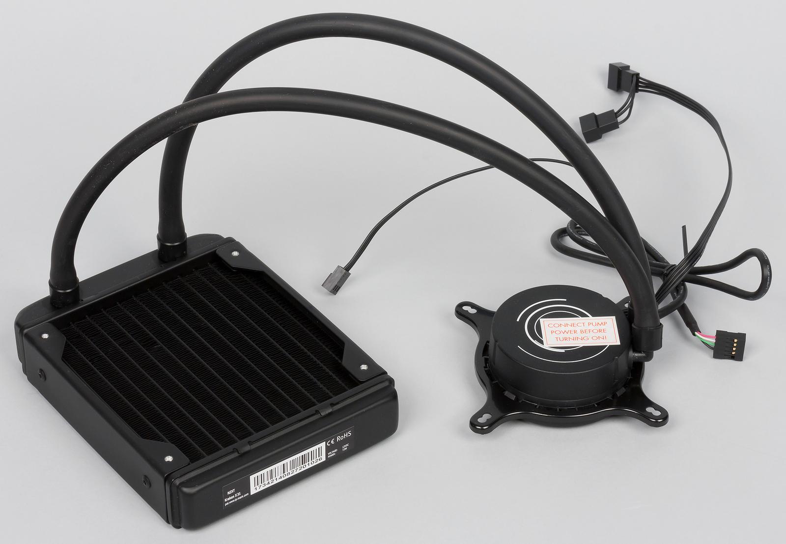 Внутри располагаются все основные компоненты этой модели, включая помпу, радиатор охлаждения, вентилятор и системы крепления под разные процессорные разъемы. В комплект поставки входит все необходимое для крепежа системы на все основные процессорные разъемы Intel и AMD. Для платформ Intel поддерживаются разъемы LGA 775, LGA 1150, LGA 1155, LGA 1156, LGA 1366, LGA 2011 и LGA 2011-v3, а для AMD — AM2, AM2+, AM3, AM3+, FM1, FM2 и FM2+. Комплектация достаточна для быстрого подключения системы к ПК. Отдельного тюбика с термопастой здесь нет, однако сама термопаста уже нанесена на основание помпы. Помпа подключается к системной плате с помощью 3-контактного разъема и управляется так, как будто к компьютеру подключен обычный вентилятор (если в системе не установлено фирменное ПО).