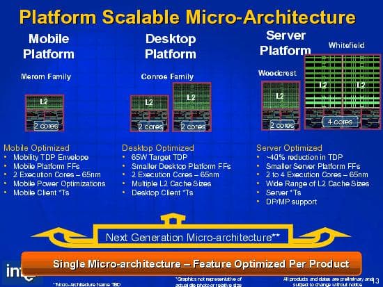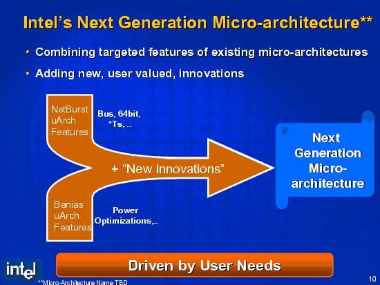 На чём базируется новая архитектура? Это самый интересный вопрос, вызывающий множество субъективных толкований. Если посмотреть на соответствующий слайд из презентации, то можно увидеть, что новая архитектура якобы в равной степени основывается на двух предшествующих: NetBurst (Pentium 4), и Banias (Pentium M).
