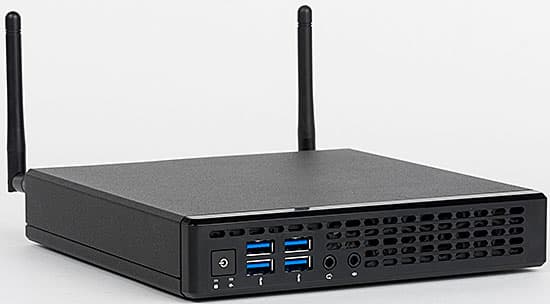 Такой подход позволяет щедрой рукой отсыпать системе всех необходимых разъемов. В частности, на лицевой панели есть целых четыре порта USB 3.0, чем может похвастаться редкий десктоп. Также здесь разместились разъемы для наушников и микрофона, а вот картовода нет. Судя по всему, компания сочла, что при отсутствии в процессоре/чипсете встроенной поддержки SD/MMC (в отличие от Atom) его все равно пришлось бы «вешать» на USB, которых здесь по сравнению с традиционными мини-ПК много, так что лучше пусть уж покупатель приобретет себе внешнюю модель, причем такую, какая ему в наибольшей степени подходит.
