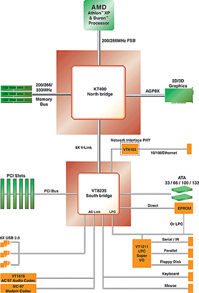 2. Те, кто предпочитает знакомиться с новинками, читая наши материалы :), наверняка уже успели прочитать статью о VIA Apollo KT333, соответственно, в данном случае мы можем смело ограничиться описанием отличий KT400 от KT333.