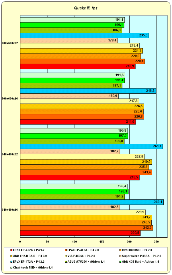 | Плата | Supermicro P4SBA | EPoX 4T2A | Intel D850MD Sample | VIA P4X266 Reference | ASUS A7V266 | Abit KG7-RAID | Chaintech 7SID | Abit TH7-II RAID |