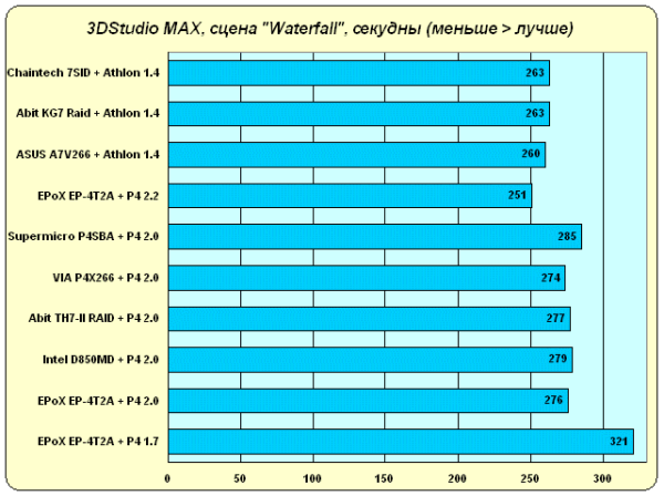 А вот практически одинаковые результаты, показанные системами на основе i850 и VIA P4X266, да и не сильно отставшая от них система на i845, четко демонстрируют то, что подсистема памяти в 3DStudio MAX нагружается не сильно, наибольшее значение имеет именно вычислительная мощь CPU.