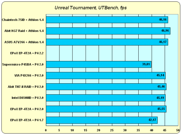 Считая основными героями данного обзора именно новые Pentium 4 2 GHz, в комментариях к результатам Unreal Tournament мы можем просто ограничиться констатацией факта: производительность самых мощных процессоров Intel и AMD примерно равна, с небольшим преимуществом последнего. И опять (как и практически везде ранее) в хвосте "плетется" Brookdale. Low-end чипсет для low-end систем, что уж тут поделаешь… :)