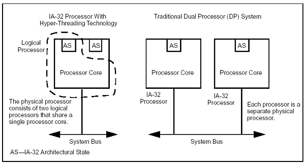 Здесь нам придется все-таки немного углубиться в технические детали, потому что иначе, увы, что-либо объяснить не получится. Впрочем, те, кому оные детали неинтересны, могут данный абзац просто пропустить. Итак, классическому «одноядерному» процессору в нашем случае добавили еще один блок AS IA-32 Architectural State. Architectural State содержит состояние регистров (общего назначения, управляющих, APIC, служебных). Фактически, AS#1 плюс единственное физическое ядро (блоки предсказания ветвлений, ALU, FPU, SIMD-блоки и пр.) представляет из себя один логический процессор (LP1), а AS#2 плюс все то же физическое ядро второй логический процессор (LP2). У каждого LP есть свой собственный контроллер прерываний (APIC Advanced Programmable Interrupt Controller) и набор регистров. Для корректного использования регистров двумя LP существует специальная таблица RAT (Register Alias Table), согласно данным в которой можно установить соответствие между регистрами общего назначения физического CPU. RAT у каждого LP своя. В результате мы получили схему, при которой на одном и том же ядре могут свободно выполняться два независимых фрагмента кода т. е. де-факто многопроцессорную систему!