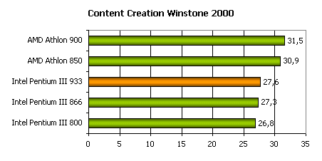 Content Creation Winstone 2000 использует для вычисления производительности несколько 32-приложений, наиболее сильно нагружающих систему. В их число входят: Adobe Photoshop 5.0, Adobe Premiere 5.1, Macromedia Director 7.0, Macromedia Dreamweaver 2.0, Netscape Navigator 4.6 и Sonic Foundry Sound Forge 4.5. Эти приложения оперируют большими объемами данных и требуют от системы в первую очередь высокой пропускной способности системной шины и шины памяти. В результате, как мы видим, по результатам этого теста Intel Pentium III 933 не дотягивает даже до 850-мегагерцового AMD Athlon.