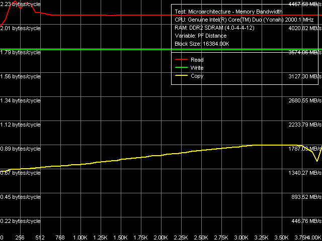 Сопоставляя внешний вид кривых зависимости ПСП от дистанции предвыборки на ядрах Yonah (рис. 2) и Conroe (рис. 3) можно заметить некоторые отличия в ее реализации. Так, на ядре Yonah максимум эффективности программной предвыборки при чтении данных наблюдается при ее дистанции в 192 байта и более-менее сохраняется в интервале 192-384 байт, после чего заметно снижается. При копировании данных эффективность предвыборки плавно возрастает при увеличении ее дистанции вплоть до 4096 байт, т.е. до границы страницы запрашиваемых данных. В то же время, на ядре Core наблюдается иная картина: максимум эффективности программной предвыборки при чтении наблюдается при ее дистанции примерно в 640 байт, после чего сохраняется практически на постоянном уровне. А операции копирования вообще оказываются гораздо менее чувствительными к программной предвыборке как таковой.