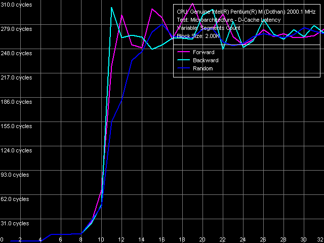 Из представленных кривых видно, что ассоциативность D-TLB равна четырем, а ее «исчерпание» сопровождается увеличением латентности L1-D кэша в среднем до 9 тактов. Такую же картину мы наблюдали при тестировании нынешней реализации Pentium M ядра Banias. Таким образом, реализация D-TLB у Dothan и Banias является абсолютно идентичной.