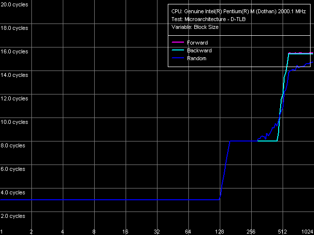 Полученные кривые выглядят достаточно четко. Размер D-TLB действительно составляет 128 записей (кстати, внимательный читатель наших статей мог вполне уже определить этот параметр, изучив вид кривой латентности случайного доступа в области L2 в ней заметно плавное возрастание латентности при размере блока 512 КБ и выше, что как раз соответствует (512 КБ / 4 КБ) = 128 записям страниц). Промах D-TLB сопровождается увеличением латентности доступа в L1-D кэш на 5 тактов, что характерно для всех процессоров семейств Pentium III, включая Pentium M. Второй скачок, наблюдающийся в области 512 страниц, связан с выходом за пределы L1 кэша данных, способного вместить (32 КБ / 64 байта) = 512 строк.