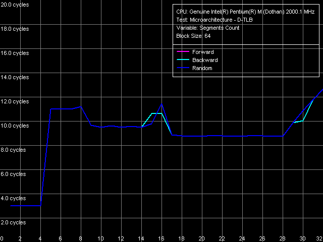 Согласно значениям дескрипторов кэша/TLB, выдаваемых функцией CPUID, в новом ядре Dothan нет каких-либо изменений параметров D-TLB и I-TLB, вроде их размера и ассоциативности. В этих, заключительных тестах мы проверим это утверждение, а также оценим, как сказывается промах D-TLB/I-TLB на величинах латентности доступа в L1-D/L1-I кэш процессора. Для начала воспользуемся тестом D-TLB, пресет D-TLB Size.