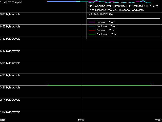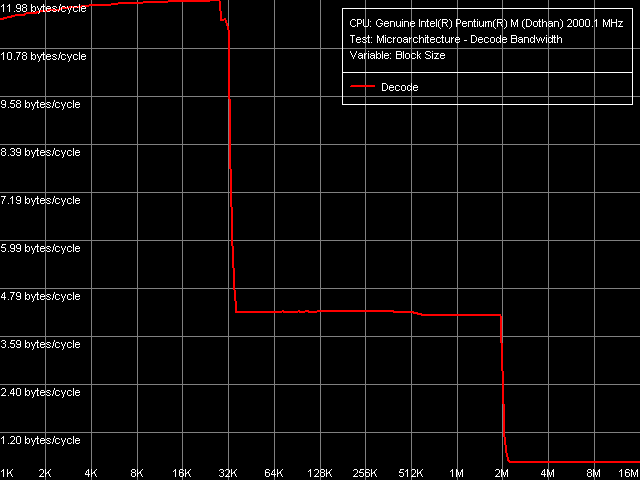 Для оценки эффективности работы кэша инструкций, декодера, конвейера и исполнительных модулей Dothan воспользуемся тестом Decode Bandwidth. Как всегда, наиболее показательный результат получился при декодировании простых, но «крупных» 6-байтовых инструкций CMP (пресет L1 I-Cache Size / Decode Bandwidth, CMP Instructions 3).