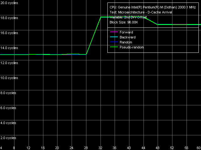 Результат получился таким же, как и на Banias, за исключением количественных характеристик (с разницей в 1 такт, соответствующей увеличенной латентности L2 кэша). А именно, латентность двух обращений остается минимальной (13 = 3 + 10 тактов) при смещениях второго элемента до 28 байт включительно, после чего она возрастает на 5 тактов, и снижается на 1 такт при дальнейшем увеличении смещения (от 48 байт и выше). Полученный результат означает, что запрашиваемая 64-байтная строка действительно оказывается доступной L1 кэшу процессора не сразу.