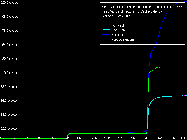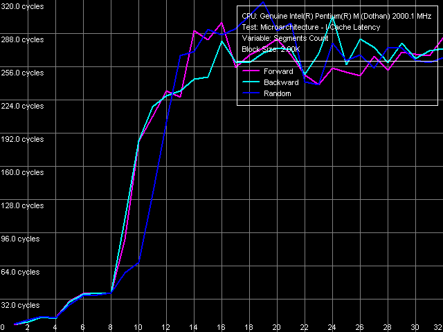 По ним заметно, что Dothan, как и его предшественник, снабжен алгоритмом Hardware Prefetch, эффективность которого можно оценить примерно в 40% (путем сравнения значений, полученных при прямом/обратном последовательном обходе и псевдослучайном обходе памяти). Кстати, отметим, что псевдослучайный режим обхода является новой возможностью теста RMMA, появившейся в версиях 2.5 и выше, тогда как данные для Banias были получены в версии 2.4, в связи с чем оценить эффективность Hardware Prefetch у последнего предложенным способом в данном исследовании не представляется возможным. Тем не менее, посмотрим на количественные характеристики латентности кэшей данных/памяти.