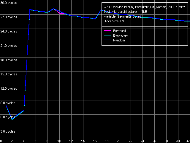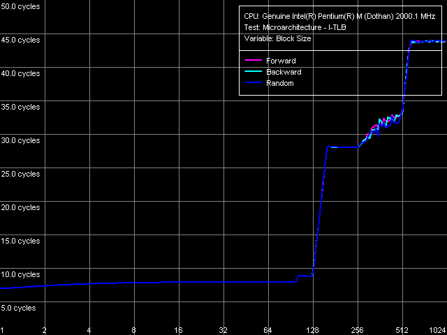 Посмотрим напоследок, что можно сказать об аспектах реализации I-TLB у рассматриваемых ядер процессора Pentium M Dothan и Banias. Начнем с определения размера этого буфера (тест I-TLB, пресет I-TLB Size, Near Jump).