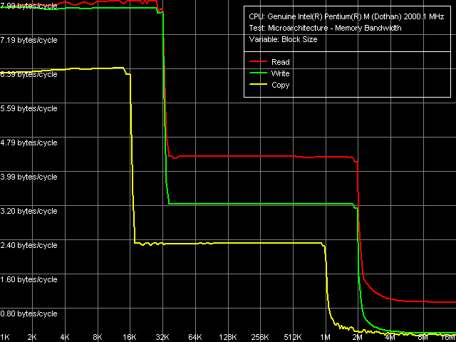 Легко видеть, что объем L2-кэша Pentium M Dothan действительно составляет 2 МБ, а его архитектура является инклюзивной, что присуще всем процессорам Intel. В данном случае это никак нельзя считать ее существенным недостатком, ибо дублирование данных, содержащихся в 32-КБ L1 кэше, занимает лишь 1.5% объема L2. Перейдем к количественным оценкам производительности различных уровней подсистемы памяти рассматриваемой платформы.