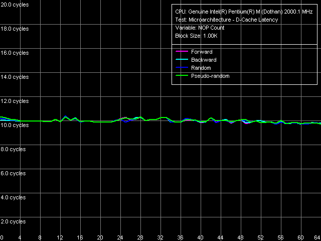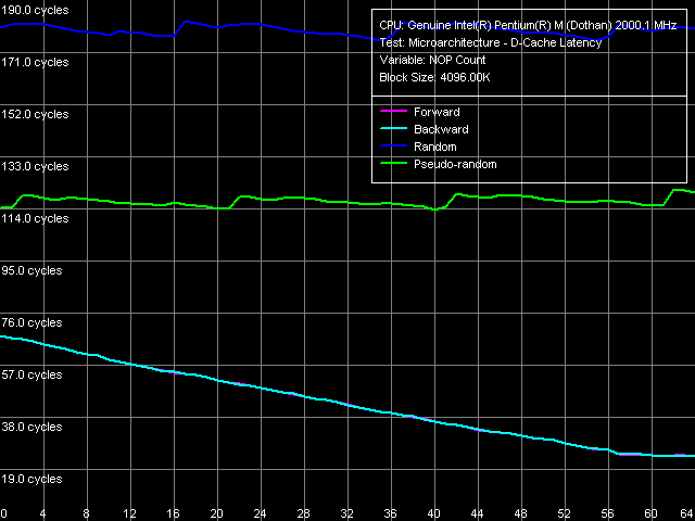 Последовательные (прямой и обратный) режимы обхода в этом случае предоставляют возможность Hardware Prefetch работать на максимум своей эффективности, в результате чего достигается латентность в 24 такта процессора (12.0 нс). Заметим, что Banias характеризуется подобным видом кривых, но разгрузка там достигается чуть менее эффективно, да и сами величины латентности выше. Значит, Hardware Prefetch в Dothan также был немного улучшен по сравнению с его реализацией в Banias. Что касается случайного и псевдослучайного обхода легко видеть, что соответствующие минимальные латентности практически совпадают со средними. Важно упомянуть уже хорошо знакомый нам «зубчатый» вид этих кривых, шаг которых (20 «NOP»-ов) соответствует коэффициенту умножения процессора. В свою очередь, это означает возможность осуществления обмена с памятью на каждом такте 100-МГц Quad Pumped системной шины процессора.