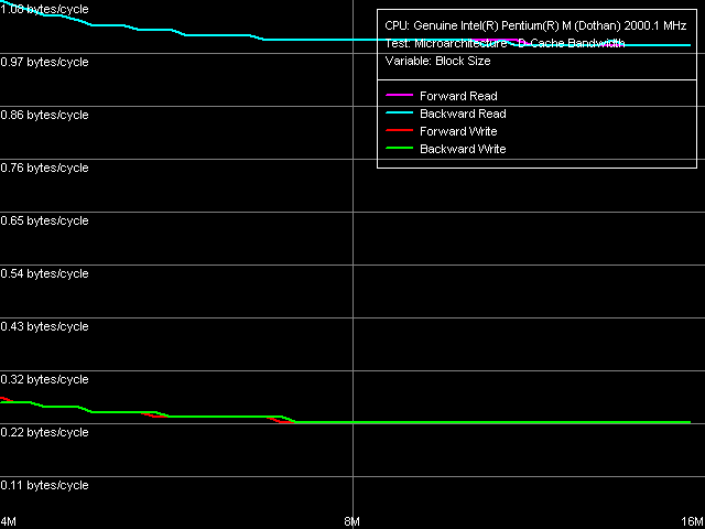 Более значимые различия наблюдаются в области L2 кэша того самого микроархитектурного компонента процессора Pentium M, который претерпел изменения при переходе к новому ядру. С сожалением отметим, что не в лучшую сторону. Эффективность чтения из L2 снизилась на 5%, записи намного больше, на 24%. Ниже мы исследуем аспекты работы L2-кэша и шины L1-L2 более детально.