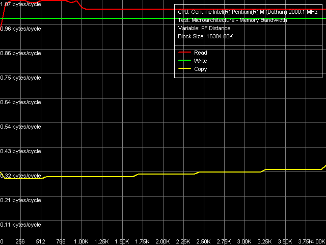 Вернемся к данным Software Prefetch. Максимум его эффективности наблюдается при длине префетча от 64 до 960 байт, и достигает примерно 81% теоретической ПСП PC2700 DDR. Кстати, реализация Software Prefetch у Dothan заметно отличается от таковой у Banias. По рисунку, приведенному в нашей предыдущей статье, посвященной исследованию его микроархитектуры, видно, что эффективность Software Prefetch у Banias достигает своего максимума при длине префетча 64 байт и выше, после чего сохраняется на постоянном уровне. Второе значимое отличие это выигрыш от использования Software Prefetch, который в случае Banias составляет величину порядка 1.08 раз. Тогда как на Dothan достигается больший прирост в скорости примерно в 1.14 раз. Таким образом, одним из важных микроархитектурных отличий Dothan от Banias является усовершенствование алгоритма Sofware Prefetch. Заметим, что подобную картину мы наблюдали и у Prescott в ходе тестирования платформ Pentium 4. Не исключено, что Intel реализовала те же задумки, которые были с успехом применены в Prescott, или хотя бы некоторые из них, в своем новом ядре Dothan.