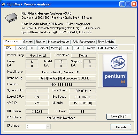 Информация о процессоре. Как и положено, он опознался как Pentium M с ядром Dothan, имеющим сигнатуру (Family/Model/Stepping) 06D8h, что отличает его от нашего предыдущего испытуемого процессора Pentium M (Dothan) с сигнатурой 06D6h. На самом деле, именно это обстоятельство и явилось поводом для настоящих исследований. Итак, мы видим, что процессор функционирует на частоте, близкой к 2 ГГц (учитывая, что система питалась от сети), частота системной шины 133 МГц (533 МГц Quad Pumped), значения множителя могут варьироваться от 6 (800 МГц) до 15 (2000 МГц). Следует однако отметить, что в режиме максимального энергосбережения процессор способен функционировать и при 600 МГц как выяснилось, посредством снижения частоты системной шины до 100 МГц, однако это уже, несомненно, тема отдельного исследования, которое мы постараемся выполнить в скором времени.