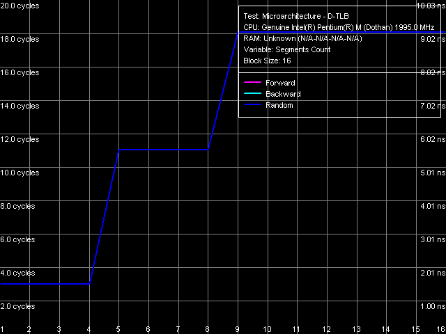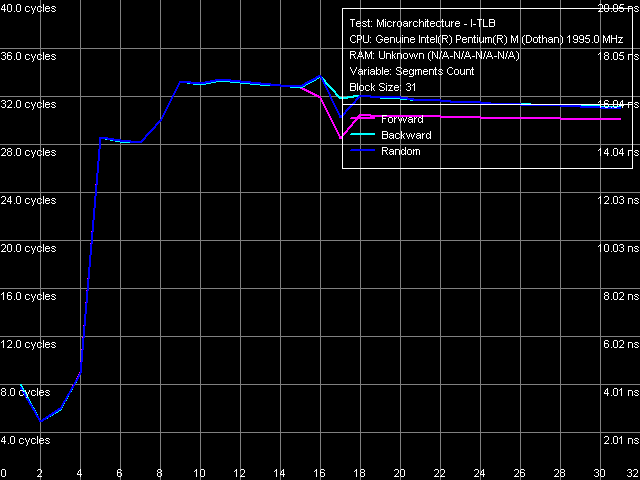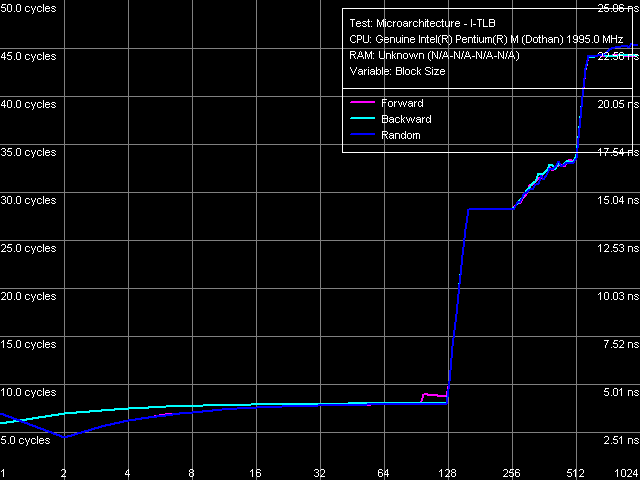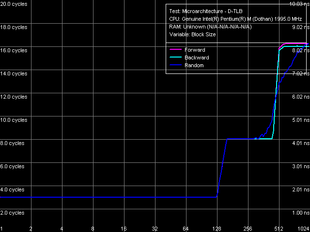 Гораздо более интересна картина ассоциативности D-TLB, характеризующаяся двумя довольно резкими скачками (что гораздо более типично для двухуровневых TLB, каждый уровень которого имеет разную ассоциативность). Первый скачок соответствует подлинной 4-входовой ассоциативности D-TLB, причина появления второго скачка, соответствующего как бы удвоенной ассоциативности, совершенно непонятна… Особенно если учесть, что таковая отсутствовала у ранней модели Dothan. Таким образом, D-TLB в новой ревизии ядра явно претерпел изменения, однако какие именно, и зачем — понять невозможно.