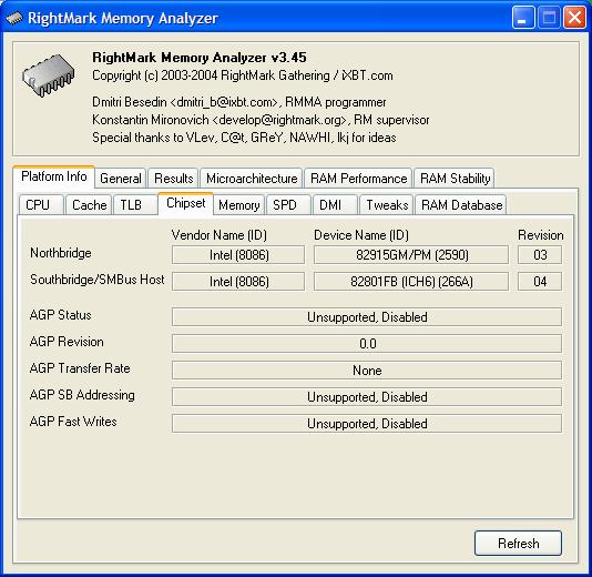 Основная информация о чипсете. Новый i915M получил идентификационный код PCI-устройства вида 8086h:2590h первое число обозначает производителя устройства (Intel), второе модель устройства. Для очистки совести отметим, что здесь мы немного слукавили сначала определили PCI Device ID нового северного моста (которое можно узнать, например, в Device Manager ОС Windows XP), и только потом добавили его определение в модуль SysInfo программы RMMA. Что касается южного моста он остался все тем же ICH6 (код устройства 8086h:266Ah), однако не исключено, что в новой платформе применяется несколько более свежая ревизия последнего (04h).