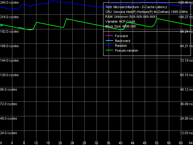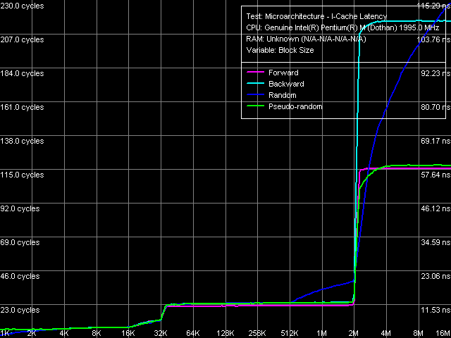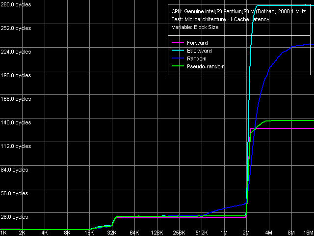 Кривые, полученные на двух разных степпингах ядра Dothan, вскрывают еще одну интересную подробность: помимо уменьшения общей задержки при исполнении кода из оперативной памяти (с 280 до 230 тактов), в новой ревизии изменилось также соотношение между кривыми случайного и обратного последовательного доступа в этой области. Новая ревизия ядра исполняет код, расположенный в обратном порядке эффективнее по сравнению со случайной последовательностью кода, а старая — в точности наоборот. Хотя, конечно, не стоит забывать, что исполнение кода в случайном и, тем более, в строго обратном направлении — весьма экзотическое извращение :). Тем не менее, его изучение позволяет в очередной раз выявить различия в алгоритмах Hardware Prefetch разных ревизий ядра Dothan.