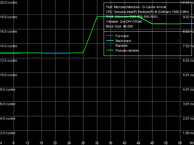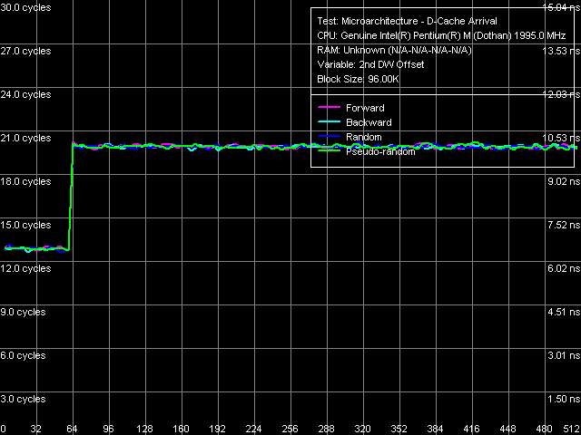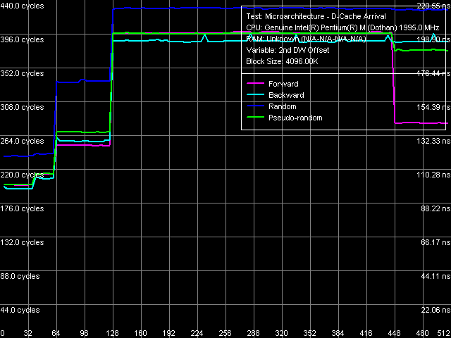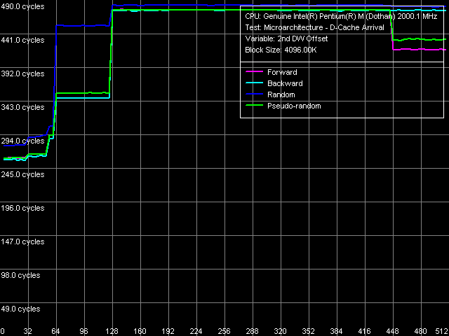 Более того, по приведенным рисункам легко заметить, что алгоритм Hardware Prefetch у двух различных ревизиях ядра Dothan отличается! (обратите внимание на кривую прямого последовательного обхода в области 448-512 байт). Найденное различие может вполне являться объяснением некоторых увиденных ранее различий в частности, более низкой латентности подсистемы памяти на новой платформе.