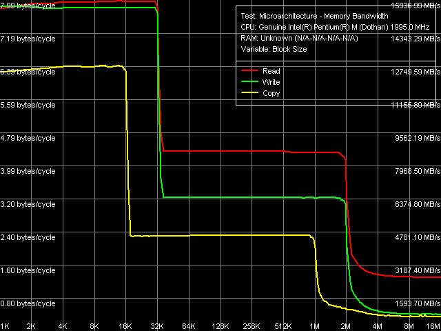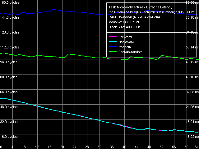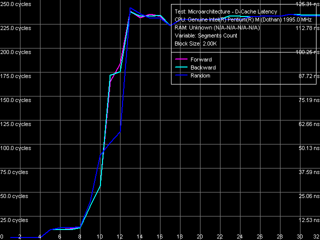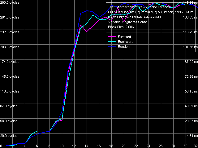 Присутствует и значительное снижение латентности доступа к оперативной памяти (исследовался 4-МБ блок), что может являться следствием как улучшения логики Hardware Prefetch процессора, так и использования нового чипсета i915PM вместо i855PM. В то же время, задержки при чтении целочисленных данных из L1/L2 кэша процессора остались равными 3 и 10 тактам соответственно.