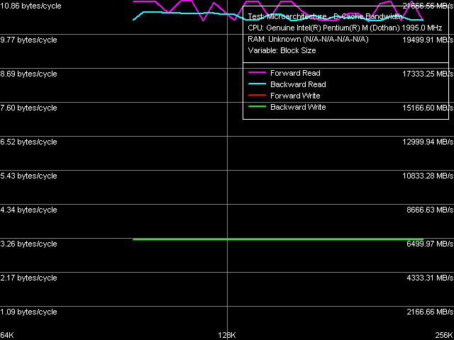 Но это лишь идеальный случай (хотя и является результатом реального измерения, но со сравнительно малым размером блока, целиком попадающего в L2-кэш т.е. измерения длины строки L1-кэша). Впрочем, он может вполне наблюдаться реально и при оценки длины строки L2-кэша например, на семействе процессоров AMD K7/K8. В нашем же случае (Pentium M) он выглядит намного запутаннее.