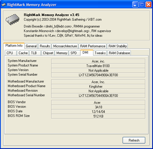 Содержимое области DMI системного BIOS впечатляет своей подробностью! Указаны не только производитель (Acer) и модель ноутбука (TravelMate 8100), но и серийный номер изделия, информация о производителе системной платы, а также версии и дате выпуска BIOS.