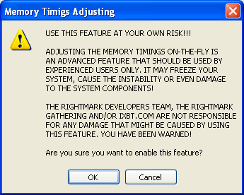 Приступая к рассмотрению реализации возможности динамического изменения таймингов в RMMA 3.3, прежде всего, предупредим наших пользователей, что такая процедура, как и всякое другое изменение любых параметров системы за их допустимые пределы, является потенциально опасной для Вашей системы. В связи с этим, первоначально при попытке включения опции Adjust Memory Timings (в разделе Platform Info, Memory) программой выдается соответствующее предупреждение: