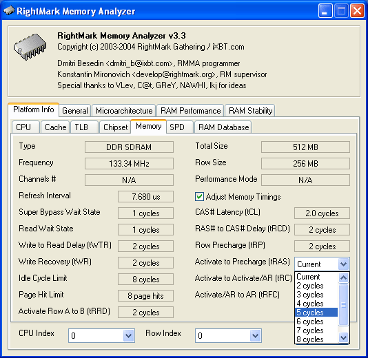 Важно отметить, что некоторые платформы позволяют выставлять разные значения таймингов для разных модулей памяти (таковым свойством обладают, как правило, старые чипсеты, способные поддерживать более одного типа памяти одновременно), либо для разных каналов памяти в асимметричном двухканальном режиме (это свойственно новейшим чипсетам, например, Intel 915/925). Выбор значений таймингов для другого модуля/канала памяти осуществляется изменением Row Index. Появившаяся в этом же разделе возможность изменения номера текущего процессора (CPU Index) в настоящее время не используется. Она имеет смысл лишь для многопроцессорных систем на базе процессоров AMD Opteron, которые, как известно, характеризуются наличием собственного (интегрированного) контроллера памяти. Поддержка интегрированного контроллера памяти процессоров AMD K8 планируется в следующей версии программы.
