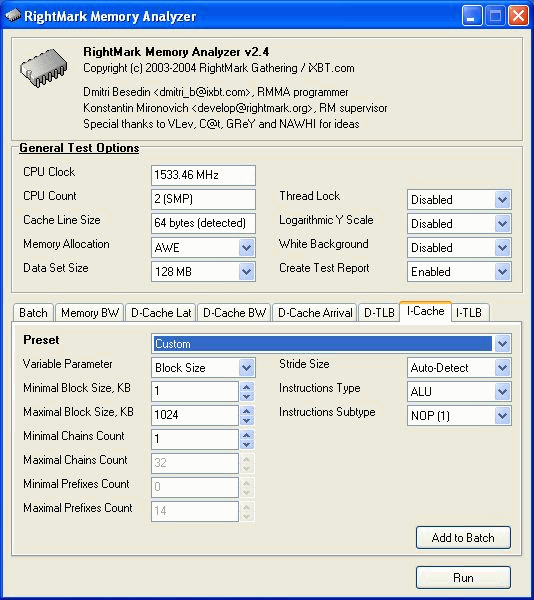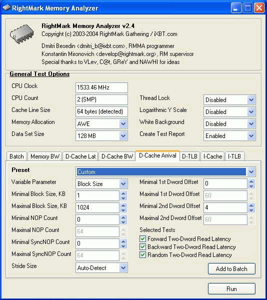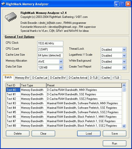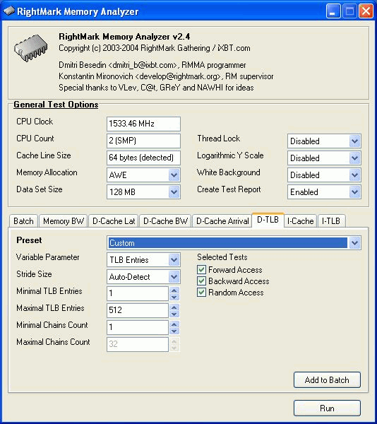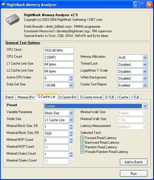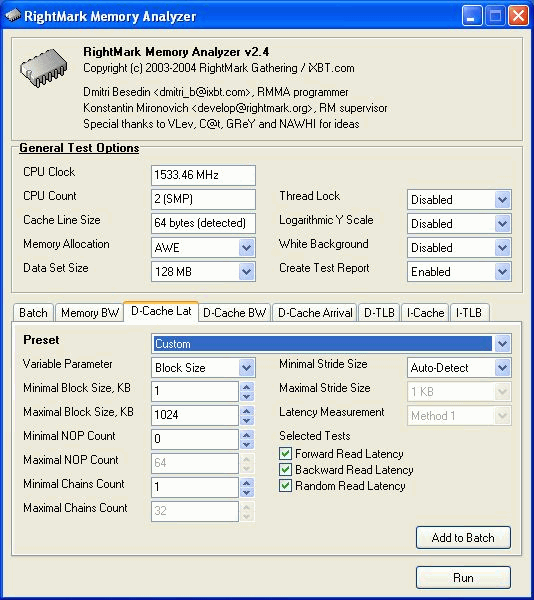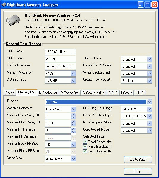 Необходимость создания данного тестового пакета вызвана тем, что до настоящего времени не существовало ни одного хорошего программного продукта для измерения важнейших параметров подсистемы CPU/Chipset/RAM, выдающего стабильные, надежные (воспроизводимые) результаты тестирования и позволяющего задавать параметры тестов в широких пределах. В качестве важнейших «низкоуровневых» характеристик системы можно перечислить латентность и реальную пропускную способность оперативной памяти, среднюю/минимальную латентность различных уровней кэша и степень его ассоциативности, реальную пропускную способность шины L1-L2 кэша, характеристики уровней TLB. При этом данные моменты в технической документации того или иного продукта (CPU или чипсета), зачастую рассматриваются недостаточно подробно, если рассматриваются вообще. Таким образом, можно смело утверждать, что подобный тестовый пакет, объединяющий в себе целый ряд подтестов, предназначенных для измерения объективных характеристик элементов системы, крайне необходим для оценки важнейших объективных характеристик платформы в целом. Предлагаемый вашему вниманию тестовый пакет разработан в рамках проекта RightMark, имеет рабочее название RightMark Memory Analyzer и доступен для ознакомления в виде открытого исходного кода (Open Source). Итак, приступим к рассмотрению самого тестового пакета.