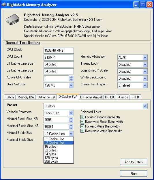 В связи с этим значения, получаемые в тесте D-Cache Bandwidth при оценке реальной пропускной способности шины L2-RAM (L2-L3, L3-RAM) оказывались заниженными, если использовался размер шага, равный автоматически определенному размеру строки (первого уровня кэша), а для получения объективных характеристик требовалось указание правильного размера шага вручную. Этот недостаток был устранен в соответствующем разделе теста появилась возможность выбора параметра Minimal Stride Size, равного как размеру строки L1, так и L2 (что продемонстрировано на приведенном выше скриншоте).