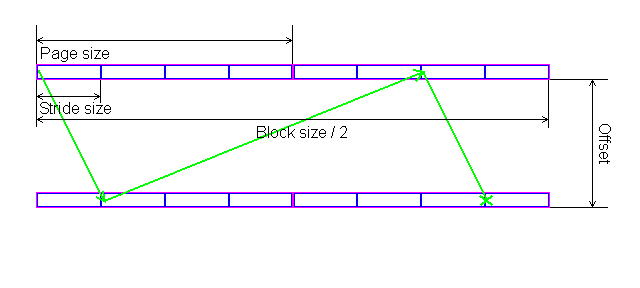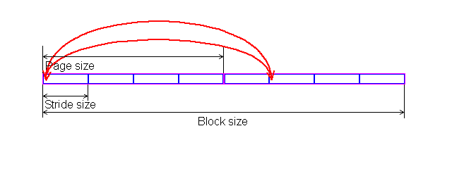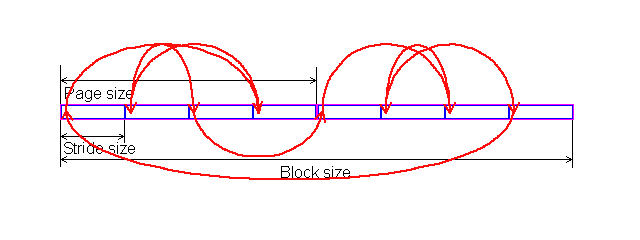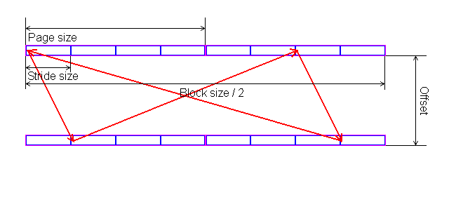 Stride Size шаг доступа по зависимой цепочке данных, в байтах. Шаг по цепочке осуществляется операцией безусловного перехода (jmp). Для примера, на рисунке приведен прямой последовательный обход четырех элементов I-TLB с двумя цепочками доступа.