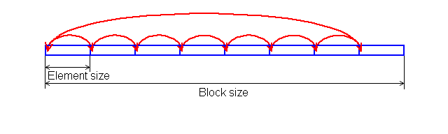 Block Size построение зависимости латентности кэша данных/памяти от размера блока. Данный режим теста позволяет получить общую картину латентности различных областей подсистемы памяти L1, L2, L3 (при наличии такового) кэша данных или оперативной памяти (RAM). Принцип его работы следующий: в выделенной области памяти создается цепочка зависимого доступа, каждый элемент которой содержит в себе адрес последующего элемента. При этом соблюдается условие, что на каждой полной итерации чтения к каждому элементу цепочки будет осуществлено строго одно обращение. Количество элементов цепочки берется равное размеру блока, деленному на величину шага по цепочке (Stride Size, см. ниже). В случае если размер шага соответствует длине строки кэша, размер блока является истинной характеристикой количества прочитанных данных (поскольку считывание данных из оперативной памяти в L2 кэш или из L2 кэша в L1 кэш осуществляется «построчно»). Таким образом, использование размеров блока, меньших или равных размеру L1 кэша позволяет оценить латентность доступа (load-use latency) к первому уровню кэша; размер блока в интервале (L1..L1+L2) или (L1..L2), в зависимости от архитектуры кэша (эксклюзивной и инклюзивной, соответственно) даст нам оценку латентности второго уровня (L2) кэша, и, наконец (поскольку L3 кэш является сравнительно редким явлением), размер блока, заведомо больший, чем сумма объемов L1+L2 кэша позволяет нам оценить латентность доступа к оперативной памяти (RAM). Порядок обхода цепочки зависит от выбранного метода тестирования (см. ниже). В случае прямого последовательного доступа (Forward Read Latency) обход осуществляется строго с первого элемента по последний, при этом последний элемент цепочки содержит указатель на первый, что позволяет многократно повторять операцию обхода. В случае обратного последовательного доступа (Backward Read Latency) первый элемент цепочки содержит адрес последнего элемента, после чего чтение осуществляется от последнего элемента к первому. Наконец, случайный доступ (Random Read Latency), как следует из его названия, характеризуется случайной последовательностью элементов в цепочке, однако условие выборки каждого из элементов строго по одному разу сохраняется. Для примера, ниже на рисунке изображен принцип прямого последовательного обхода цепочки из 8 элементов.