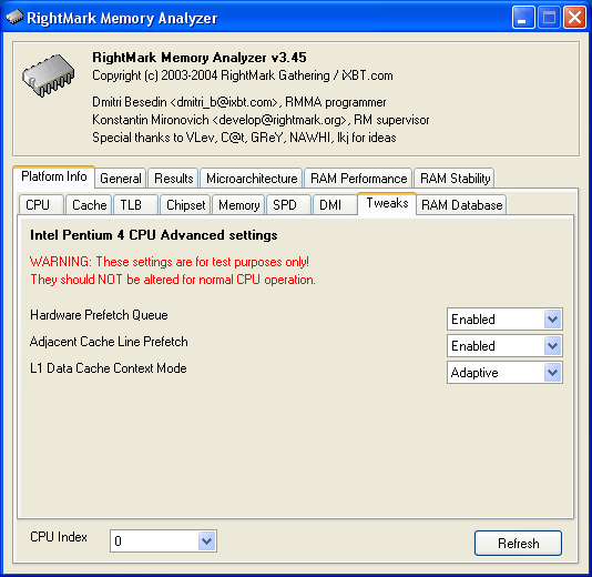 Итак, вроде бы все хорошо что же еще можно придумать, чтобы обмануть весьма хитрый алгоритм предвыборки, и зачем? Начнем с вопроса «что». Обмануть алгоритм Hardware Prefetch, пожалуй, уже никак нельзя, но можно ведь… совсем отключить аппаратную предвыборку! Такая возможность заложена во всех процессорах Pentium 4 и Xeon, но соответствующие настройки в BIOS доступны, как правило, только для последних. С них-то все и началось, мы решили провести небольшое исследование влияют ли они на результаты тестов, и если да, то как оказалось, что очень даже влияют! В связи с чем, в новой версии RMMA 3.45 было решено добавить их в виде отдельной закладки (в последнее время мы очень любим «играться» со специфическими настройками процессоров Pentium 4). Вот как выглядит эта закладка.