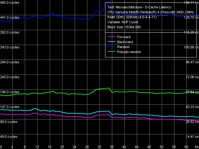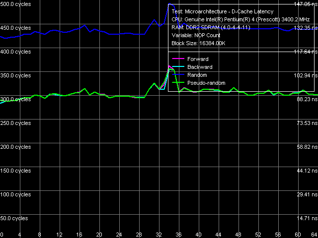 Кривые псевдослучайного и случайного обхода сохраняются на почти постоянном уровне, т.е. эффективность алгоритма Hardware Prefetch не изменяется при увеличении разгрузки Bus Interface Unit (BIU) процессора. В отличие от кривых прямого и обратного линейного обхода памяти, где разгрузка шины явно увеличивает эффективность Hardware Prefetch. На основании анализа этих данных в свое время был сделан вывод о том, что измерение латентности памяти данным образом (используя данные псевдослучайного обхода) можно считать вполне адекватным.
