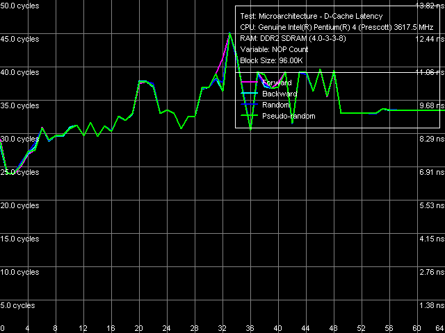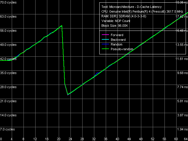 Следует вновь отметить снижение латентности доступа в оперативную память (по сравнению с исследованной ранее платформой Pentium 4), практически незаметную при прямом и обратном обходе, и максимальную (20-25 нс) при случайном обходе. Заметим, что величины минимальной латентности доступа в память практически не отличаются от «средних» величин, полученных в предыдущем тесте, за исключением разве что прямого и обратного режимов обхода, в которых алгоритм аппаратной предвыборки получает дополнительное преимущество от разгрузки шины L2-RAM (BIU). Разумеется, подобное утверждение не распространяется на случай измерений при отключенном алгоритме Hardware Prefetch.
