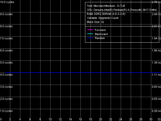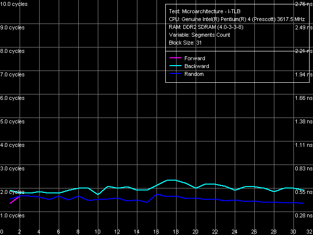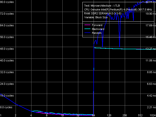 Ассоциативность I-TLB, Pentium 4 660 и Pentium 4 EE 3.73Объем I-TLB 64 записи (напомним, что этот ресурс при включении технологии Hyper-Threading разделяется пополам между логическими процессорами), штраф промаха буфера 45 тактов (прямой, обратный обход) и более (случайный обход), ассоциативность полная.