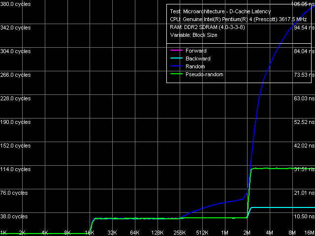 Итак, латентность памяти при всех режимах обхода несколько снизилась по сравнению с ранее тестируемой платформой Pentium 4 (Prescott D0) наиболее заметно снижение латентности случайного обхода (порядка 20 нс), очевидно за счет нового чипсета i925XE (ибо Hardware Prefetch при случайном обходе, как мы показывали ранее и увидим ниже, практически бездействует). Отметим также, что латентность памяти на Pentium 4 EE 3.73 несколько ниже наиболее очевидное объяснение заключается в синхронности функционирования подсистемы памяти на этой платформе.