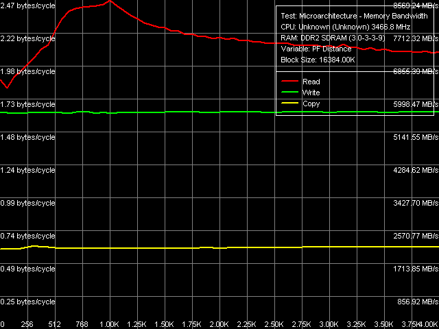 Кривые зависимости реальной ПСП на чтение и копирование от дистанции программной предвыборки на (рис. 2) выглядят типично для ядер класса Prescott (внешне они совпадают с кривыми, полученными на процессоре Pentium 4 Extreme Edition 3.73 ГГц).