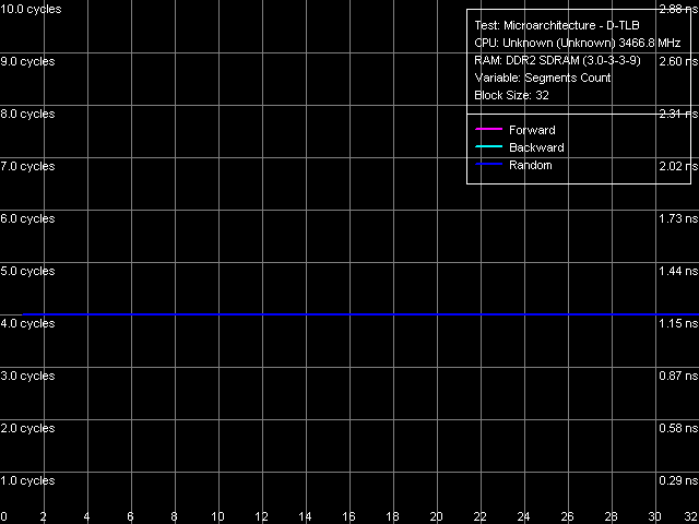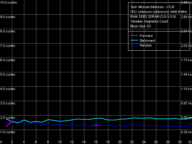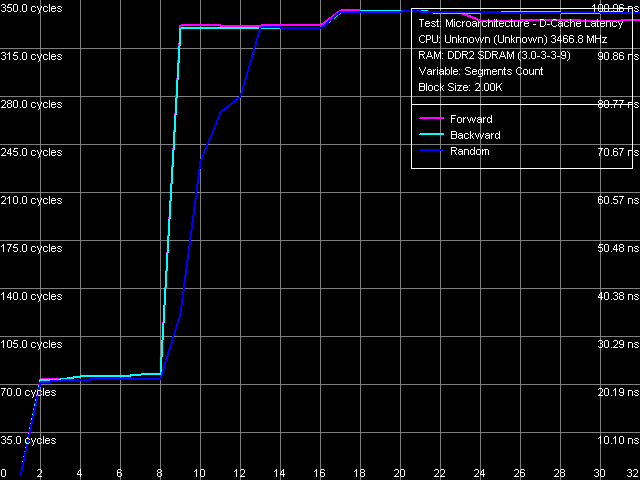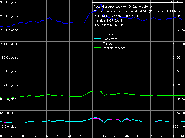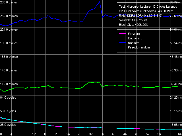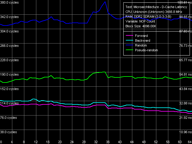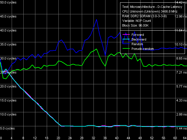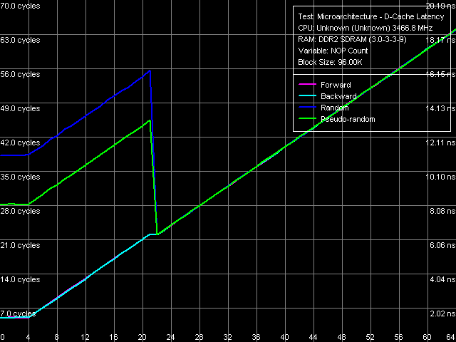 Начнем рассмотрение режимов обхода L2-кэша в обратном порядке. Итак, привычный (для ядер Prescott и их последователей) вид кривых сохраняется только в случае истинно случайного обхода 96-КБ блока данных, находящихся в L2-кэше минимальная латентность составляет 24 такта, разгрузка шины не наблюдается при вставке даже большого количества NOP-ов. Псевдослучайный обход дает очень похожую кривую, но смещенную относительно основной примерно на 2 такта вниз соответственно, минимальная латентность в этом случае равняется 22 тактам. С чем связано некоторое снижение латентности при псевдослучайном обходе не очень понятно, но аппаратная предвыборка данных здесь не причем т.к. разгрузка шины здесь также не наблюдается. Последняя вступает в силу лишь при строго последовательном (прямом и обратном) обходе цепочки данных, расположенных в L2-кэше наблюдается типичная картина разгрузки шины с достижением 5(!)-тактной латентности L2-кэша при количестве NOP-ов свыше 21 (в первом приближении получаем, что вставка каждого последующего NOP-а в области от 0 до 21 снижает латентность L2-кэша на 1 такт).