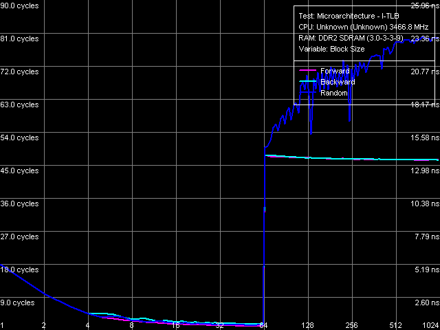 Объем I-TLB (рис. 14) 64 записи, штраф промаха буфера 45 тактов (прямой, обратный обход) и выше (случайный обход), ассоциативность (рис. 15) полная.