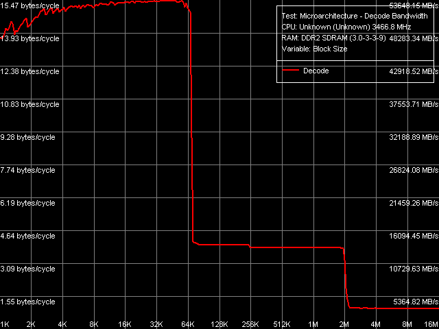 Предположение подтверждается увеличение объема L2-кэша до 2 МБ вновь сопровождается уменьшением предельной скорости декодирования крупных простых инструкций до 4.0 4.14 байт/такт. Каких-либо иных отличий нового ядра Presler от Smithfield и Prescott N0 в этой серии тестов не наблюдается.